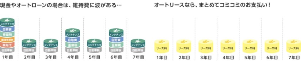 オートリースでは、保険・メンテナンス・車検・税金などにかかる費用が毎月のリース料に含まれているので、バラつきがちな車両の維持費が一定額に抑えられます。