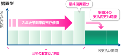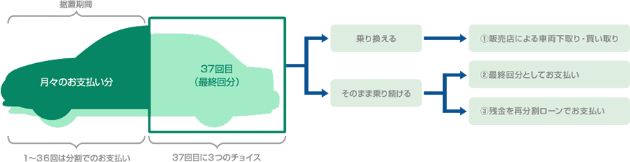 車両購入価格の一部を据え置いて、残った金額を36回分割でお支払いいただきます。据置分(37回目の最終回分)のお支払い時には、3つのパターンをお選びいただけます。